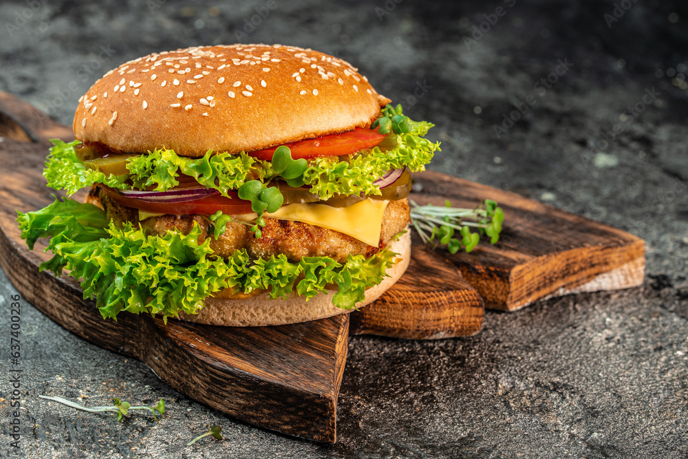 fresh homemade burger with beef, tomato, cheese, and lettuce. fast food and junk food concept