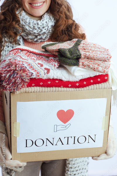 Stylish 40 years old woman in sweater, mittens, hat and scarf