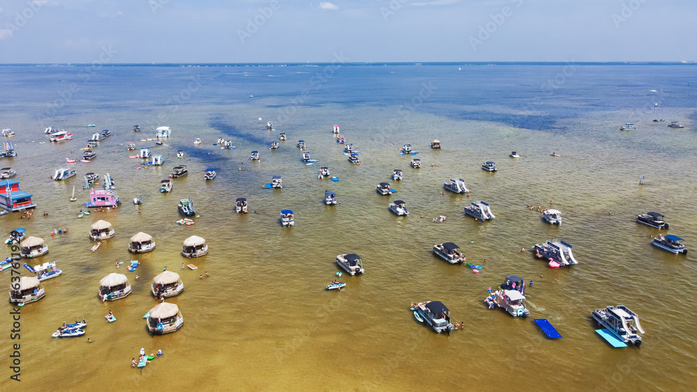 Mixed of brackish water and turquoise ocean at Crab Island with crowd of people swimming, wading, pontoons, jet skis, paddleboards at low-tide, Choctawhatchee Bay