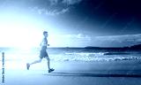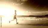 Man running on tropical beach at sunset