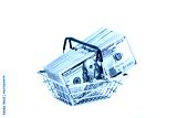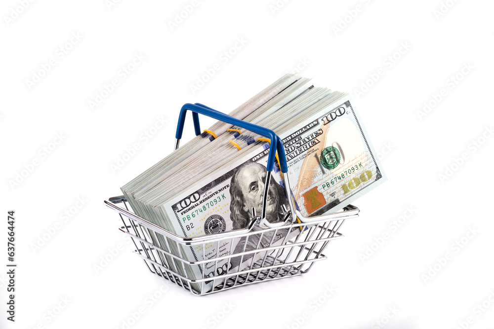A large stack of 100 american dollars denominations and a metal miniature shopping basket from a supermarket on a white background