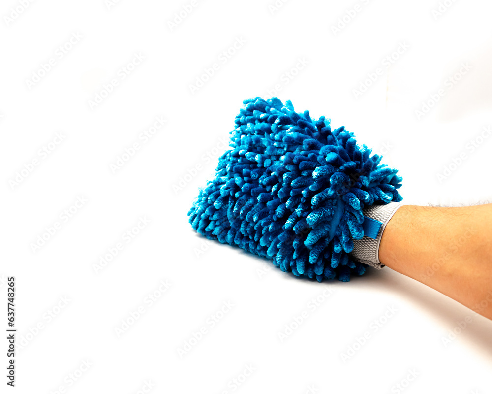 Right Asian man hand wearing brand new car wash microfiber mitt isolated on white background, multi-purpose gloves absorbent reusable with long soft chenille fibers lift and trap dust