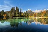 Picturesque view at autumn Welsperg lake in Dolomite Alps. Canali Valley, Primiero San Martino di Castrozza, Province of Trento, Italy. Landscape photography
