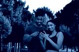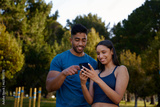 Happy young multiracial couple in sportswear smiling while using mobile phone in park