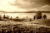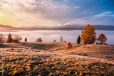 Amazing scene on autumn mountains. Yellow and orange trees in fantastic morning fog. Carpathians, Europe. Landscape photography