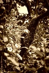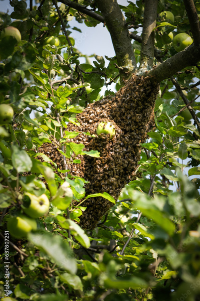 A bee swarm flies out of the hive and concentrates on an apple tree in garden. The beekeeping and honey production concept