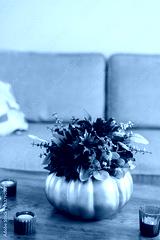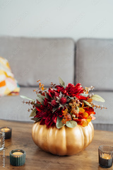 Autumn bouquet of bright artificial flowers in a golden pumpkin vase, burning candles on the wooden coffee table in living room interior. Hygge home fall decor for a cozy home atmosphere. Vertical