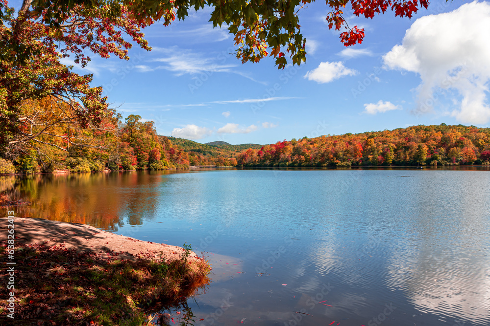 View of Price Lake in Julian Price Park on Blue Ridge Parkway near Blowing Rock, North Carolina in fall season.