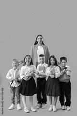 Little school children with female teacher on light blue background