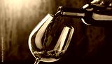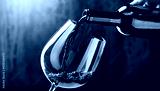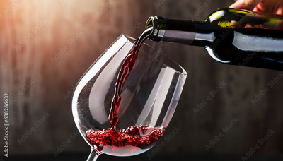 Red wine bottle pouring wine in a glass on a dark bar background, copy space