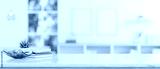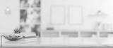 Copy space on a white table over a blurred modern white living room in the background.