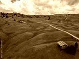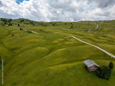 Wooden hut on Armentarola fields Aerial view of Dolomites Alps near Alta Badia, Trentino-Alto-Adige region, Italy. Summer season.