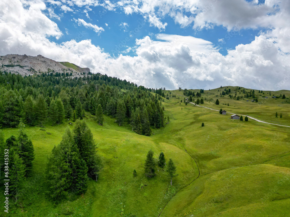 Armentarola fields Aerial view of Dolomites Alps near Alta Badia, Trentino-Alto-Adige region, Italy. Summer season.