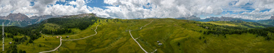 Armentarola fields Aerial view of Dolomites Alps near Alta Badia, Trentino-Alto-Adige region, Italy. Summer season.