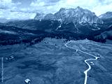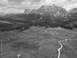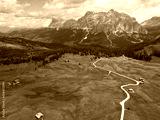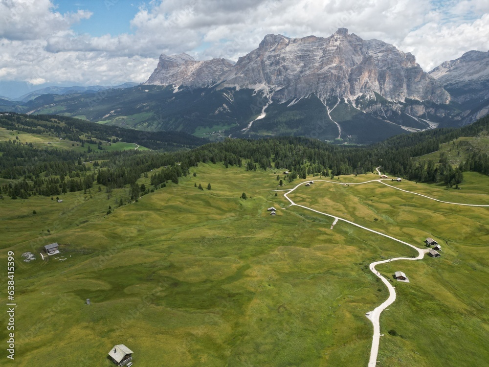 Armentarola fields Aerial view of Dolomites Alps near Alta Badia, Trentino-Alto-Adige region, Italy. Summer season.