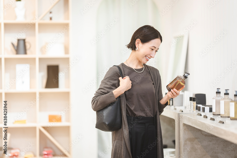 店舗で商品を手に取り選んでいる日本人女性/ショッピング