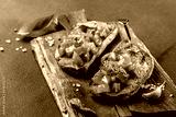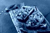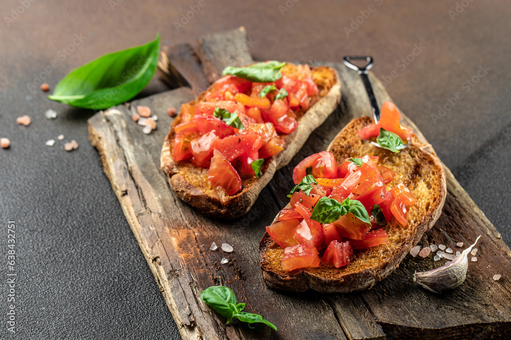 Delicious Italian tomato bruschetta with fresh basil leaves slices on wooden board. place for text, top view