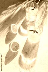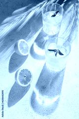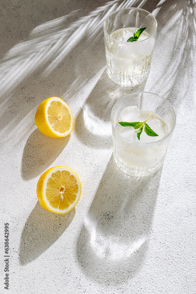 Crystal glasses with fresh homemade citrus lemonade with ice and mint leaves. Refreshing summer drink