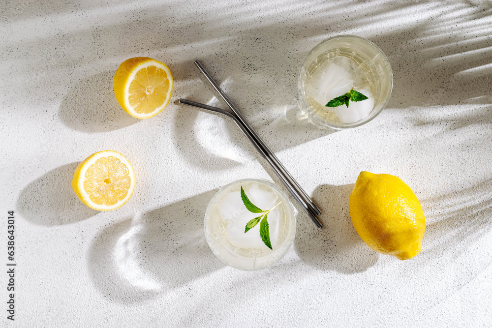 Crystal glasses with fresh homemade citrus lemonade with ice and mint leaves. Refreshing summer drink
