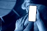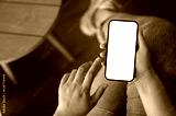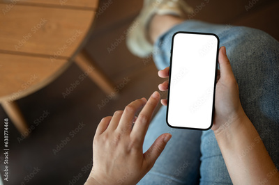 Top view of a female holding a smartphone white screen mockup over a blurred background