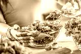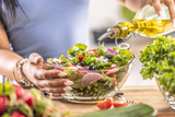 The final preparation of a healthy salad and at the end the woman pours olive oil