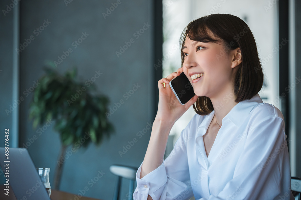 スマートフォンで通話をする笑顔のビジネスウーマン