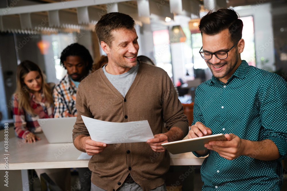 Business solutions, technology and strategy concept. Colleagues working and brainstorming in office