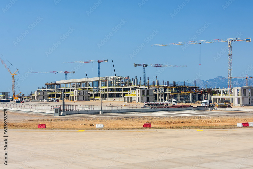 Construction of a new airport terminal building, view of cranes machinery and aircraft parked around. Transport hub reconstruction.