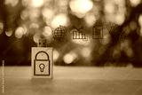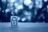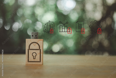 Padlock icon inscription on wood usb stick with digital security icon. Concept for secure data storage