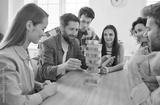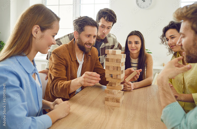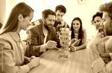Portrait of smiling happy young friends guys and girls playing together with wooden building blocks at home sitting at the table enjoying time together. Home leisure and board games concept.