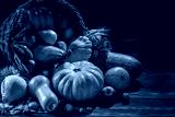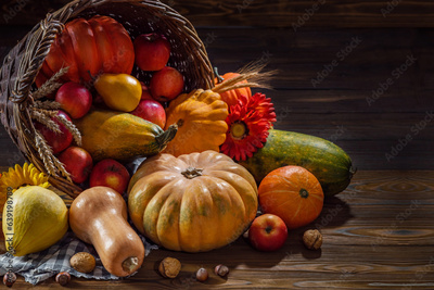 Thanksgiving day still life, background with empty copy space. Pumpkin harvest in wicker basket. Squash, vegetable autumn fruit, apples, and nuts on a wooden table. Halloween decoration fall design