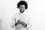 Smilling charismatic man with afro hairstyle using smartphone isolated on white, handsome male office employee, freelancer, manager messaging online, checking emails, using mobile app