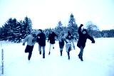 Having fun outdoors. Positive excited young friends in warm clothing running over winter hill while having fun in forest. Young active Caucasian men and women have fun together on winter day.