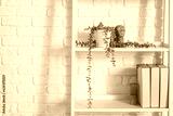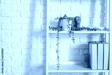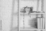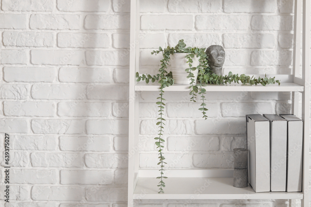 Shelf unit with plant and folders near white brick wall