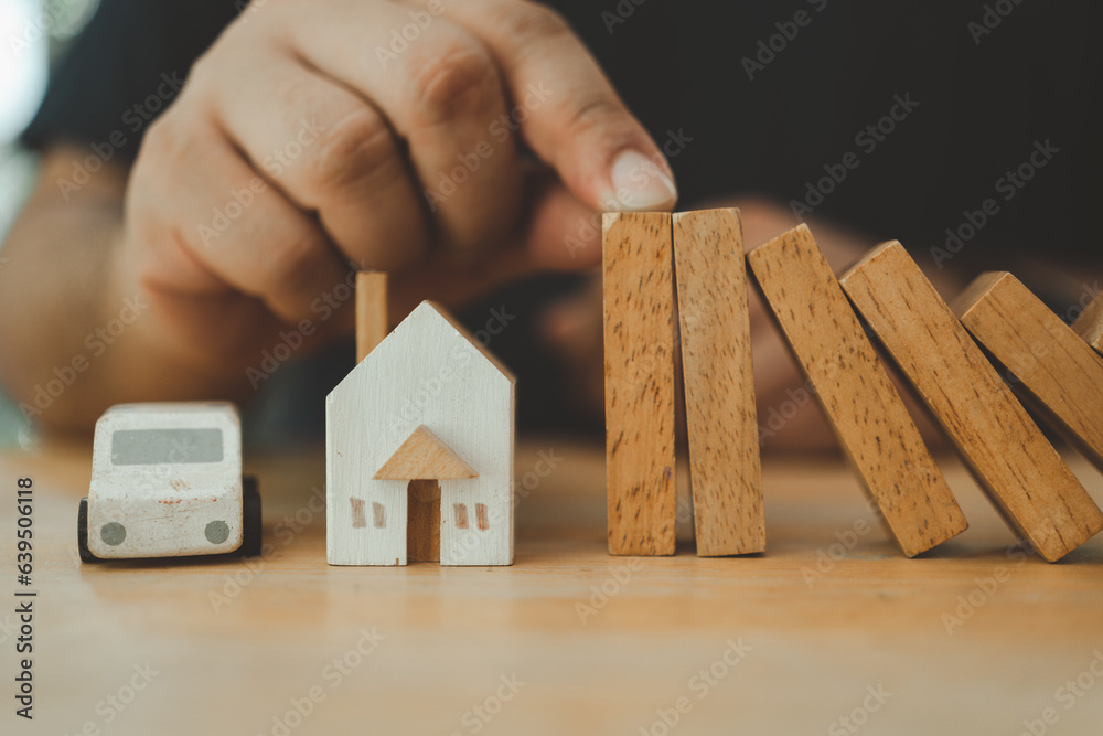 Hands protect domino. Businessman hands stop dominoes falling effect from continuous toppled to house and car. The concept of insurance home and travel