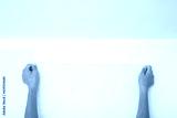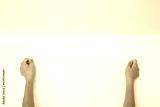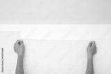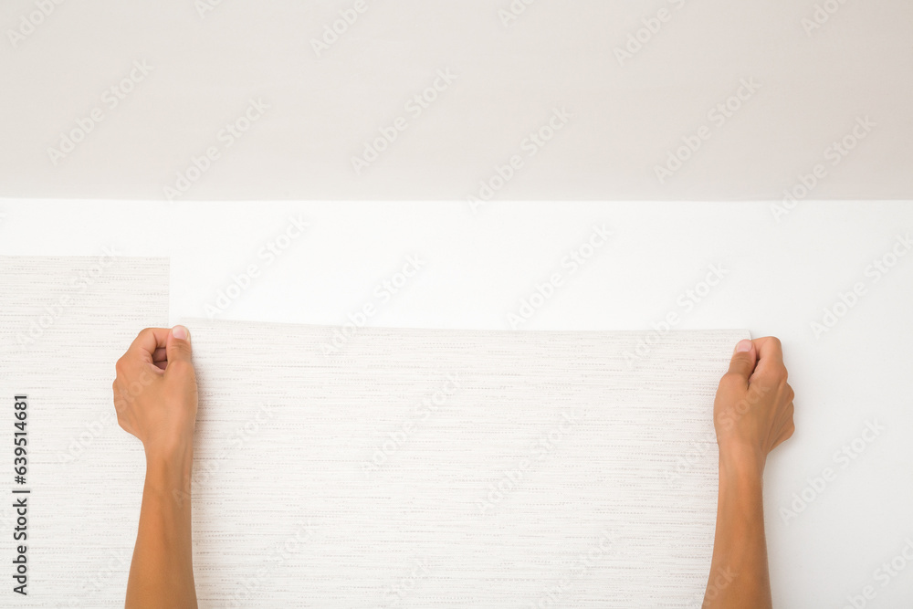 Young adult woman hands applying new light gray wallpaper on white wall. Closeup. Repair work of home. Point of view shot.