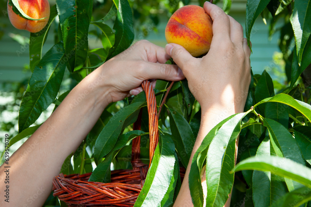 eco farming and harvesting. summer or autumn peach orchard harvest. fruit harvesting. fresh and organic healthy fruit. gardening agriculture peach cultivation. organic food. harvest of fruit