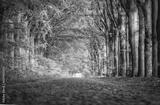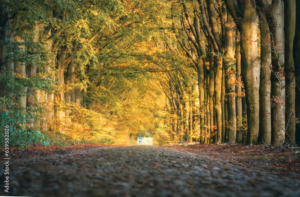 Country road through forest with fall colors and autumn sunlight through the beech trees