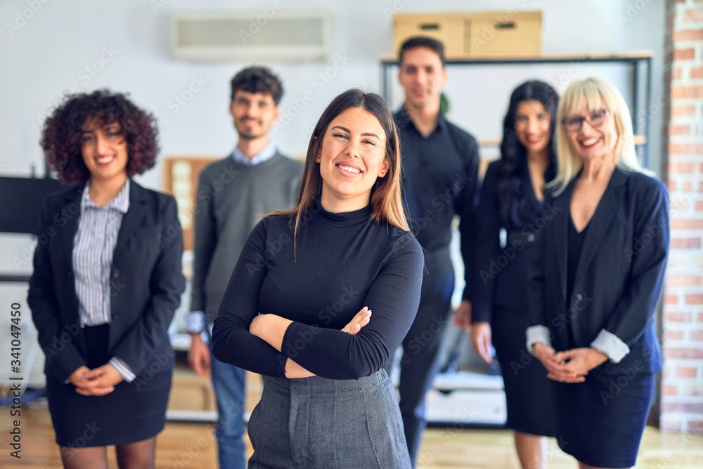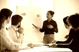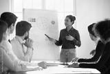 Focused indian young female presenter or coach talk make flip chart presentation for diverse colleagues at meeting, ethnic woman trainer speaker present business project on whiteboard at briefing
