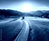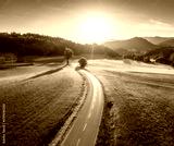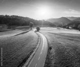 Aerial view of road in alpine meadows at sunset in autumn. Top view of rural road, mountains, forest in fall. Colorful landscape with country roadway, orange trees, hills, yellow grass in Slovenia