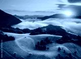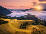 Aerial view of alpine meadows and mountains in low purple clouds at sunrise in autumn. Top drone view of hills, yellow grass and trees in fog, colorful sky in fall. Slovenia. Nature. Mountain valley