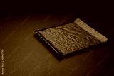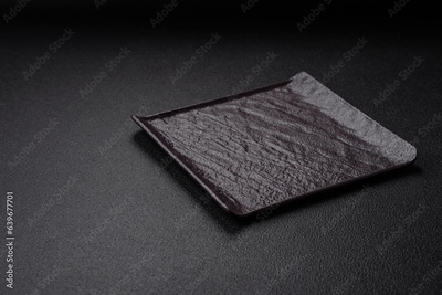 Empty black square ceramic plate on dark concrete background