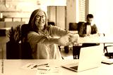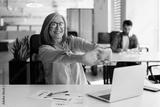 Portrait of smiling senior woman using laptop stretching arms, relax, taking a break working online in modern office. Successful confident businesswoman, entrepreneur finish work
