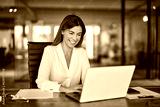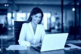 Happy cheerful mid aged business woman executive in office using laptop at work, smiling professional mature 40 years old female company manager working on computer at workplace.