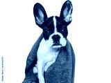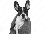 Cute brown puppy and blue towel. Close-up, indoors. Studio photo, isolated background. Concept of care, education, obedience training and raising pets
