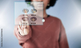 Woman, hand and HUD in online shopping on food menu, UI or UX of digital hologram or dashboard. Closeup of female person in ecommerce, choice or selection on futuristic display, website or app icon
