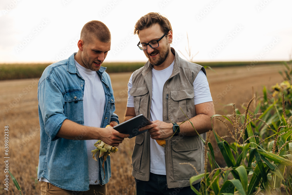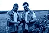 Agronomists use digital tablet for monitoring growth in the field.
