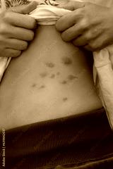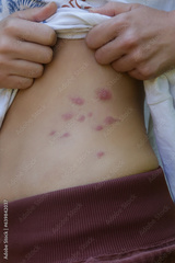 Red, swollen and itchy spots on skin caused by insect bites or allergy. Skin reaction to insect bites.