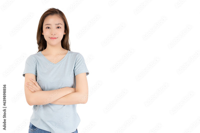 Portrait smiling young asian woman with crossed arms Happy asia girl posing with crossed arms and looking at camera isolated on white background copy space Confident female get happy and feel relax