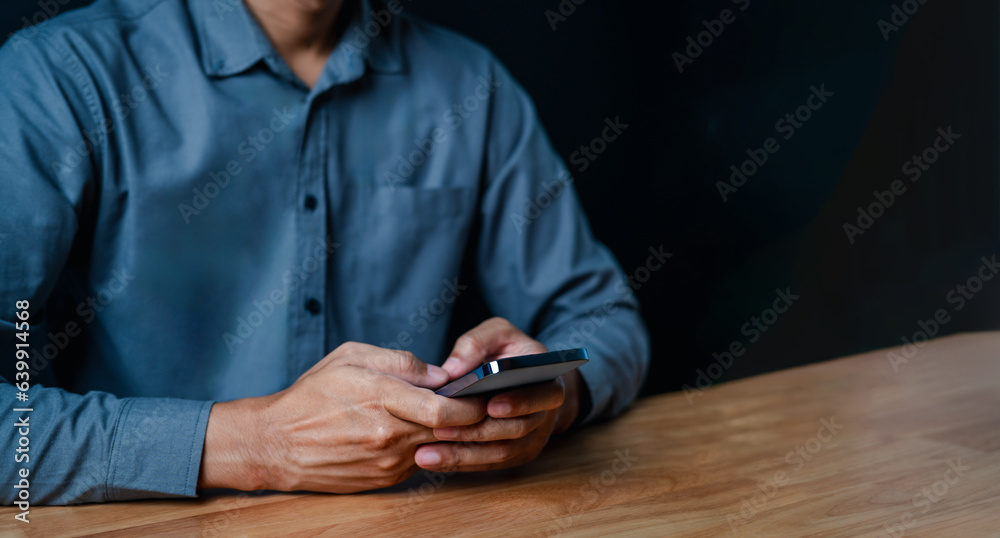 smart phone, close up, people, hand, businessman, portrait, showing, background, blue, equipment. picture is portrait close up to businessman, him hold smart phone and look fixedly at, then play it.
